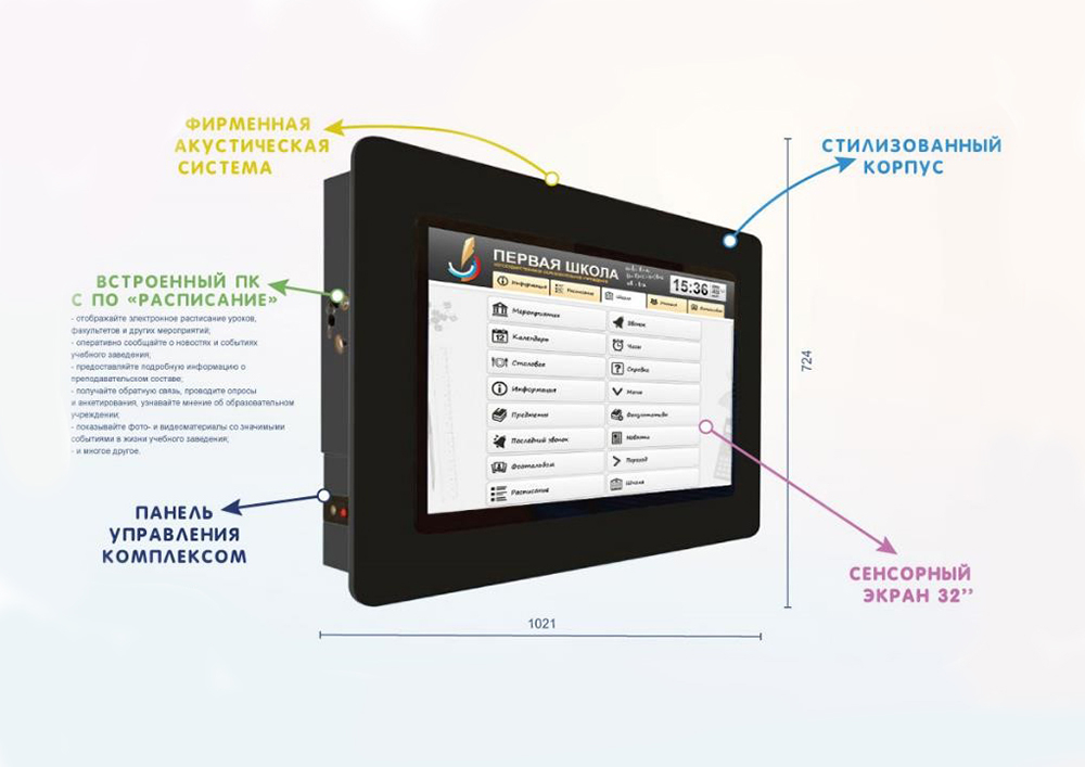 • на интерактивной панели, которая обычно располагается в холлах, вестибюлях, коридорах и рекреациях, полностью отображается необходимая учащимся информация.