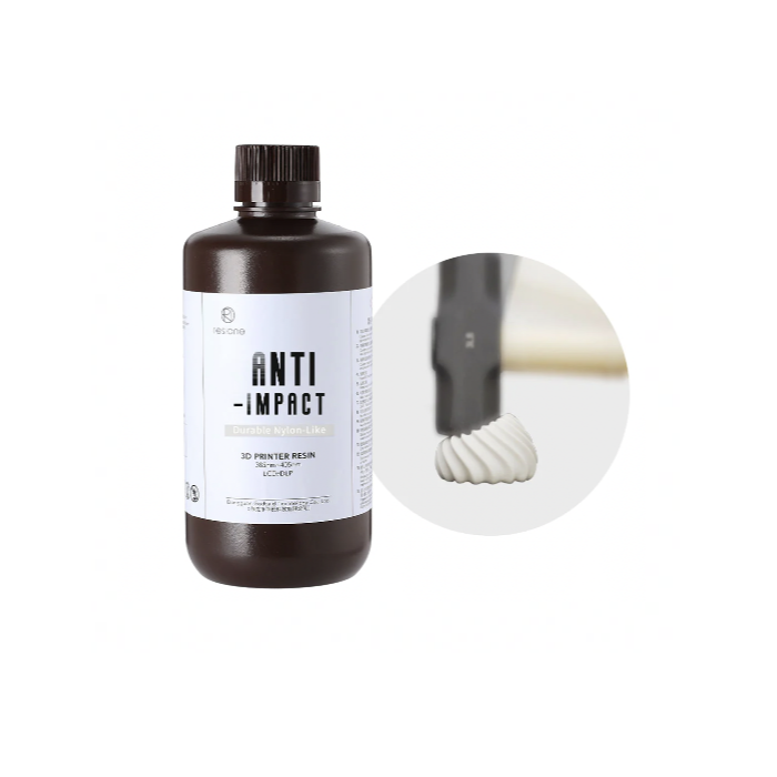 Фотополимер RESIONE Anti-Impact - высокая ударная вязкость и прочность на растяжение. Противоударная смола представляет собой прочный нейлоноподобный материал, обладающий впечатляющей ударной вязкостью и прочностью на растяжение. Его печатные объекты отличаются исключительной долговечностью, низким водопоглощением, высокой точностью размеров и износостойкой поверхностью, обеспечивающей долгий срок службы. Благодаря своим стабильным механическим свойствам, отличной усталостной прочности и атмосферостойкости эта смола идеально подходит для создания деталей, требующих повторяемой механической обработки, работы во влажных или подводных условиях, ударопрочности, защелкивающихся элементов или даже продуктов конечного использования.