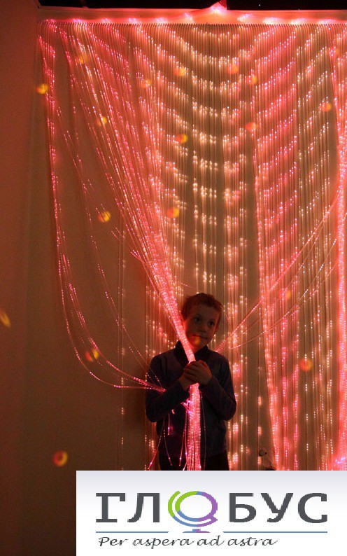 Главная Каталог Сенсорная комната Фиброоптические изделия Мерцающий занавес в комплекте с источником света (ширина: 240 см количество нитей: 240 штук)