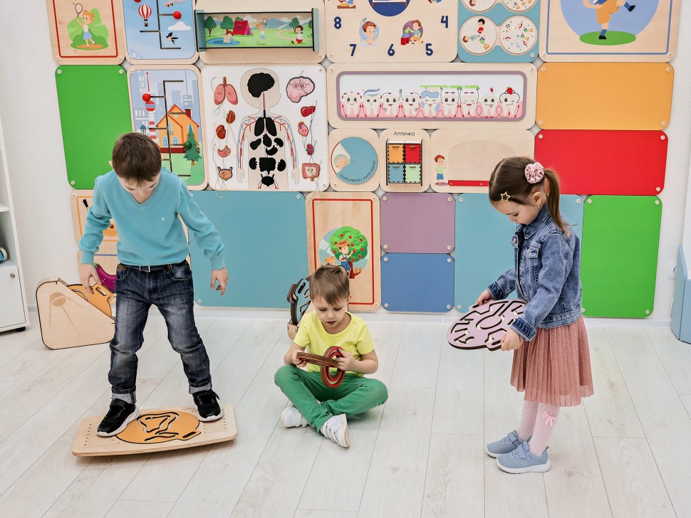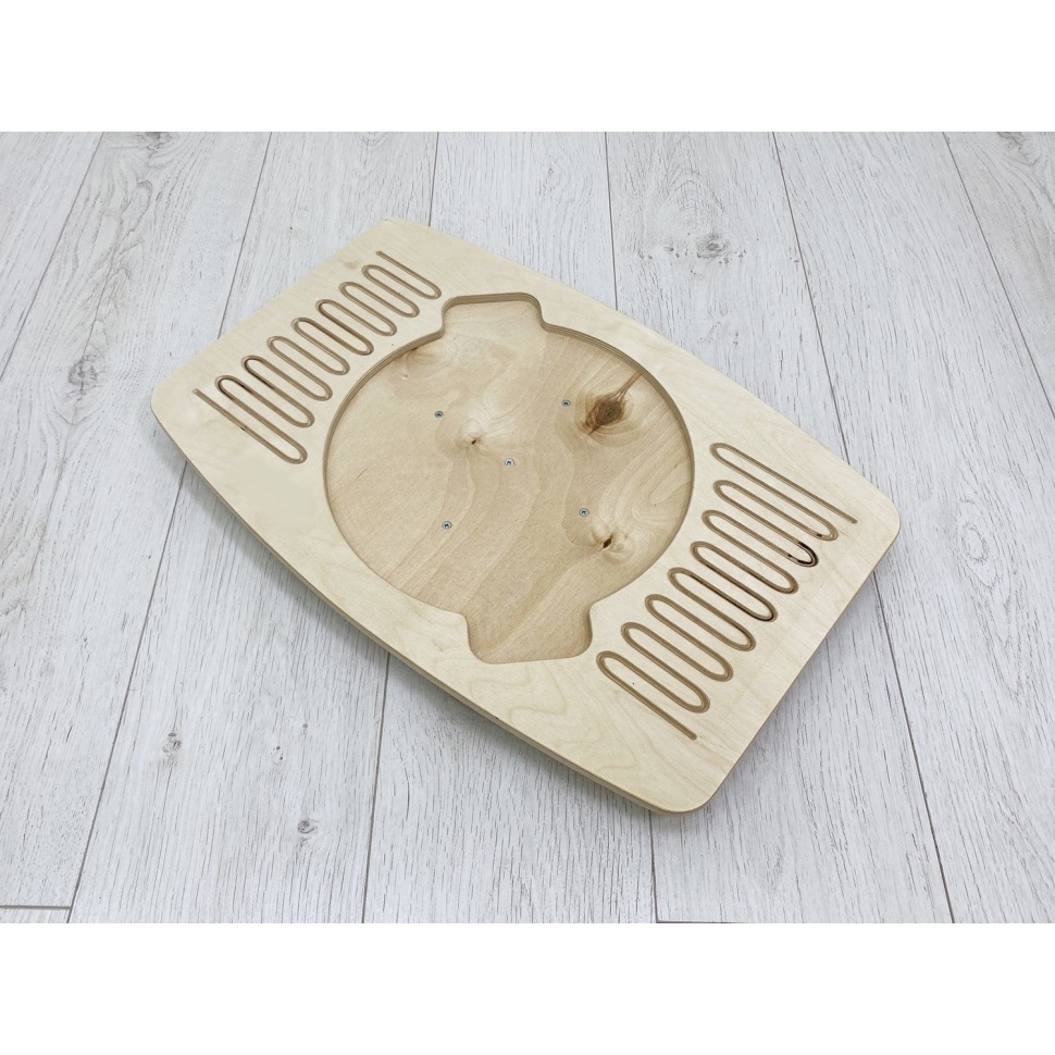 Это игровой тренажёр, улучшающий работу мозга через тренировку всего тела. Состоит из прямоугольной доски, закреплённой на неустойчивом основании в виде полусферы. В зоне ног ребристая змейка и противоскользящее покрытие. В центре балансира углубление под вставку-лабиринт. Её можно заказать отдельно.